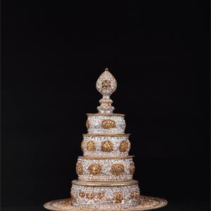 尺寸:高22.5cm 宽17.5cm 重530g 说明:此件为藏传特色的民族供器,藏族称之为“供曼扎”,通体银鎏金工艺,雕工考究,以高浮雕工艺建筑,一共六层,由上而下,底部为托底,中间叠高四层圆盘,上部为将军帽羚。每层银鎏金浮雕工艺,图案不一,展现的文化底蕴层出不穷,各具特色,图案皆以鎏金的形式表现,独特而精美。分别展示的是“农耕文化”、“八宝图”、“佛文化”等民族融合的文化精髓,是一件极具民族特色的一件藏品,喜欢的师友欢迎前来竞拍!