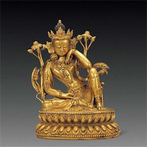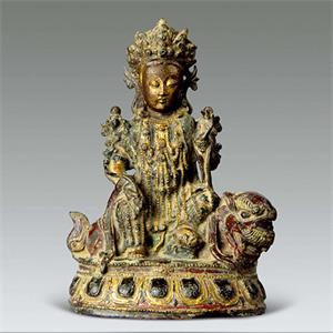 规格:高:18厘米,重:1801克 品相:完整 说明:说明:此件文殊菩萨像,头戴五叶宝冠,宽额丰腴,眼睑微垂,嘴角上扬,神态安静祥和胸前饰,联珠式璎珞,双臂、腕、踝都带钏环,整体装饰繁缛。菩萨宽肩细腰,身体呈三折枝式,体态优美,极富动感。从造型风格及錾刻鎏金工艺看,仍可显见工艺精湛。